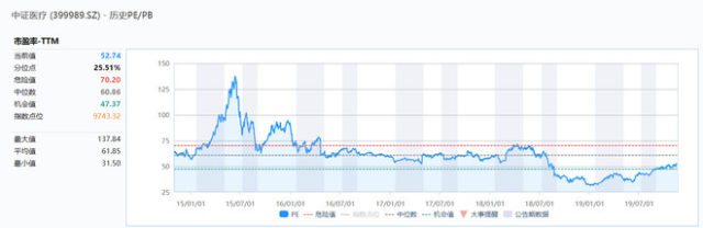 截至2019.11.22,中证医疗指数的动态市盈率为52.74倍,远低于其历史中位数61倍。虽然今年以来吃药喝酒行情得以延续,指数的估值有所修复,但其仍然处于历史底部区间。