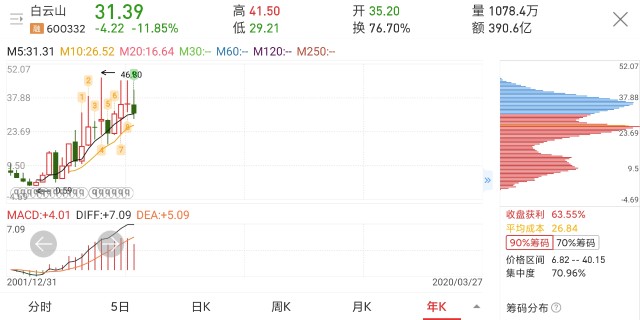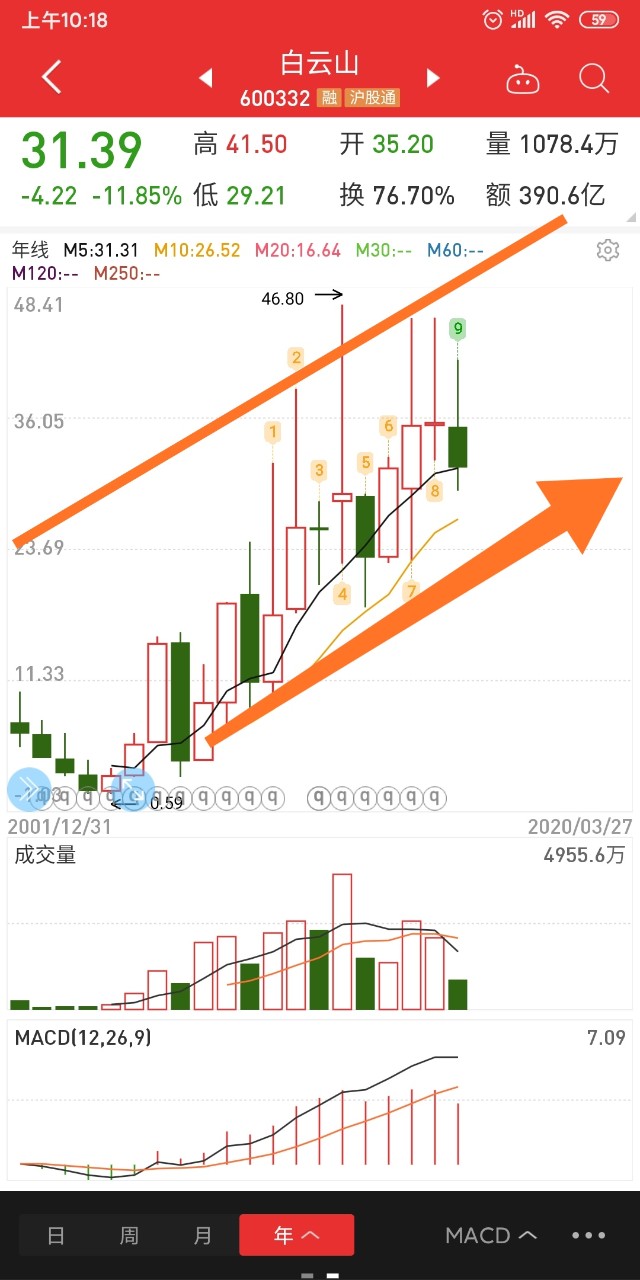 第一点,看下面白云山的年线长线趋势图