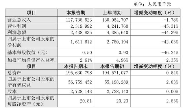 净利润大幅下降42.03%,营业总收入、营业利润、利润总额、归属于上市公司股东的净利润、基本每股收益、加权平均净资产收益率等主要财务指标也都是同比下滑。