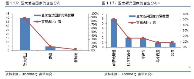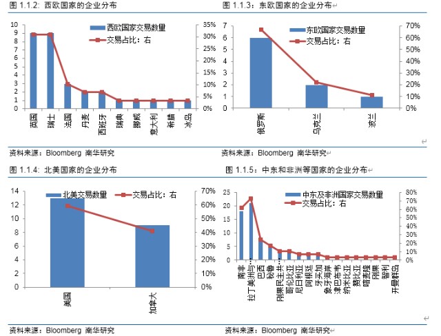 按交易数量去看,西欧地区,位于英国和瑞士的企业最多,占比达到31%;北美地区,位于美国的企业最多,占比达到59.1%;中东和非洲地区,位于南非和拉丁美洲加勒比的企业最多,占比在60%-70%;东欧地区,位于俄罗斯的企业最多,占比达到66.7%;亚太发达地区,位于澳大利亚的企业最多,占比达到86.96%;亚太新兴地区,位于哈萨克斯坦的企业最多,占比达到50%。