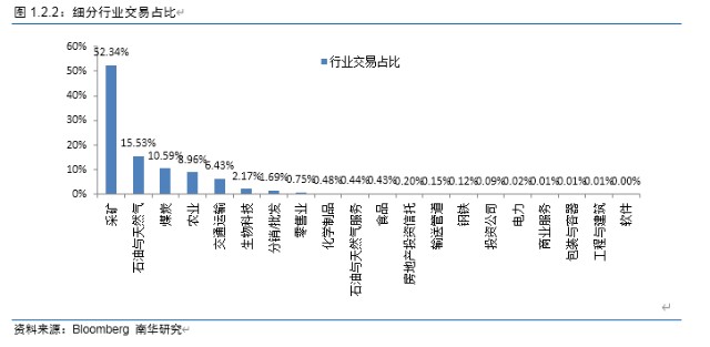 行业细分去看,采矿业交易占据行业交易的半壁江山,占比达到52.33%,由此可以看出嘉能可基础材料指的是采矿业;能源行业中煤炭和天然气行业交易占比分别为10.6%和15.9%。