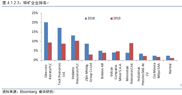从锌矿产量企业分布去看,排名首位的是Glencore Xstrata PLC,占比20.15%;排名第二的是Teck Resources Ltd,占比17.26%;排名第三的是Vedanta Resources PLC,占比13.13%;排名第四的是Zijin Mining Group Co Ltd,占比8.7%。在这9年当中,Glencore Xstrata PLC和Teck Resources Ltd锌矿产量增长最为明显,2010年,两家矿企锌矿产量占比分别为9.4%和8.8%,赶超当时排名第一Vedanta Resources PLC(10.28%)。