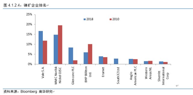 从镍矿产量企业分布去看,排名首位的是Vale S.A,占比16.65%;排名第二的是MMC Norilsk Nickel OJSC,占比14.9%;排名第三的是Glencore PLC,占比8.4%;排名第四的是BHP Billiton Ltd,占比5.95%。在这9年当中,镍矿产量分布比例发生较大变化。Vale S.A和Glencore PLC这两家企业/集团镍矿产量占比明显提升,2010年,其占比分别为11.79%、1.87%。而当时排名首位的MMC Norilsk Nickel OJSC和排名第三的BHP Billiton Ltd镍矿产量占比明显下滑,2010年,两家矿企镍矿产量占比分别为19.59%、10.06%。