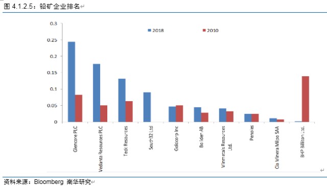 从铅矿产量企业分布去看,排名首位的是Glencore PLC,占比24.37%;排名第二的是Vedanta Resources PLC,占比17.66%;排名第三的是Teck Resources,占比13.20%。在这9年当中,铅矿产量分布比例发生较大变化。Glencore PLC和Glencore PLC这两家企业/集团铅矿产量占比明显提升,2010年,其占比分别为8.26%、5%。而当时排名首位的BHP Billiton Ltd.镍矿产量占比明显下滑,下滑幅度为13.6%。