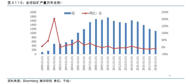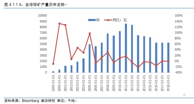 与铜矿产量增长模式一样,2010到2011年,嘉能可锌矿产量增长较快,2012年之后,嘉能可锌矿和全球锌矿产量同步回落。同比数据也能证明嘉能可锌矿产量的变化对全球锌矿产量的影响。