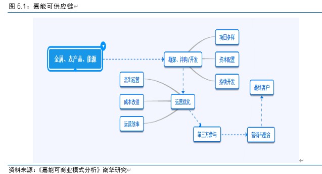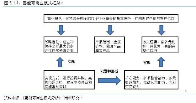 为了将自身商业理念转化为企业价值,嘉能可采用了进行投资并购、完善市场网络、建设物流体系和实施套利策略四种方式。其商业模式框架如图所示: