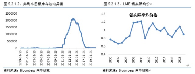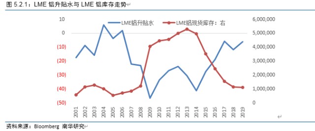 从铝的升贴水走势去铝的库存走势去看,2001年~2009年,两者符合一般规律;2010年~2014年,两者违背一般规律,呈现同向运行;2015年~2019年,两者走势符合一般规律。