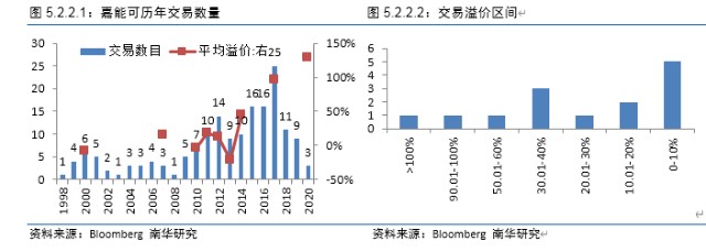 下图看出,嘉能可在2012年、2015年、2016年以及2017年交易数量特别多,且2011年、2012年、2014年以及2017年平均溢价特别高,均超过10%,也高于嘉能可并购企业的平均溢价区间【0,10%】。