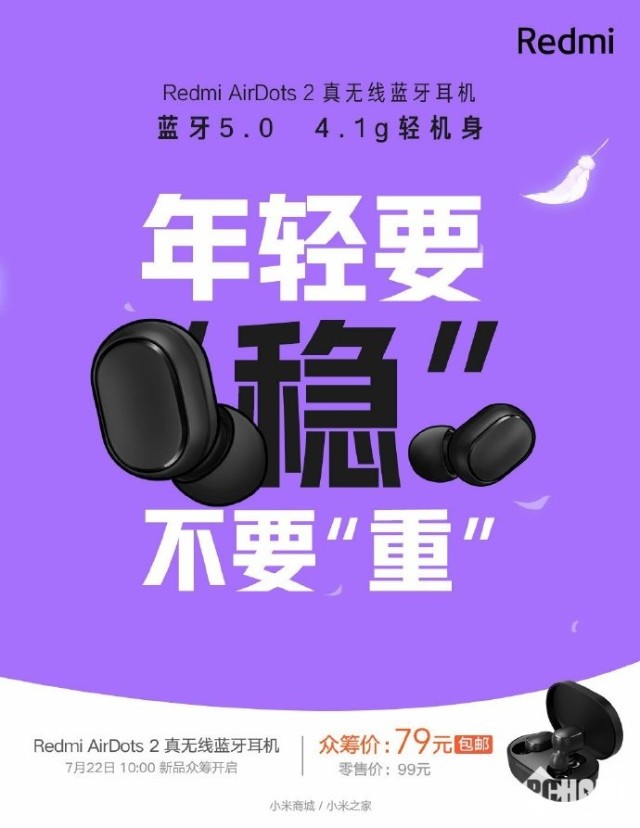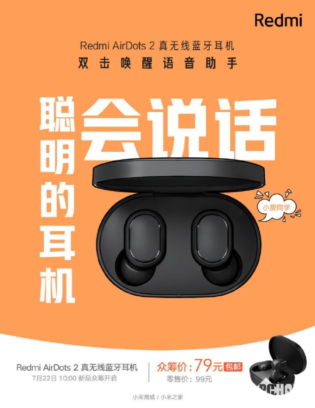 7月20号消息,小米商城官微宣布Redmi AirDots 2真无线耳机将于7月22日上午10点在小米商城、小米之家开启众筹,零售价99元,众筹价仅需79元,而且还提供包邮。