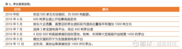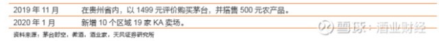 进入消费升级新时代,为深入触及消费者,茅台致力于直销渠道的推进。茅台的渠道改革开始于 2019 年,19 年开始,公司收回500家左右经销权,约 6000吨配额用于直销渠道改革。同时开始招募电商、KA 等渠道,投放1499 元平价茅台。2020 年 1 月公司新增19家KA渠道,直销进程加速,为公司渠道改革和市场控制奠定基础。