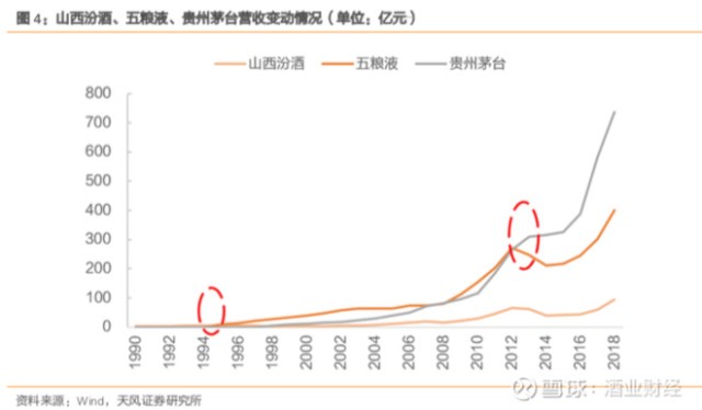 改革开放后,行业老大更换了三家:一是受益改革开放带来体制变革的山西汾酒,二是充分受益品牌化红利的五粮液,三是品牌护城河不断拓宽的贵州茅台。