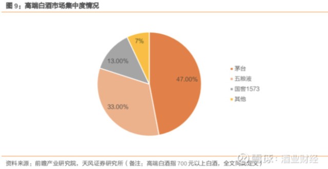 自2015年白酒行业复苏以来,白酒行业加快发展和整合。其中,高端白酒率先整合,茅五泸均对品牌建设和渠道升级进行变革,当前高端白酒行业格局基本稳定,形成以茅台、五粮液和国窖1573三大高端白酒为核心,外加少量的酒鬼酒内参、梦之蓝等。茅台占高端酒半壁江山,五粮液约占1/3,国窖1573占13%的份额,其他品牌则分享剩下的7%份额。