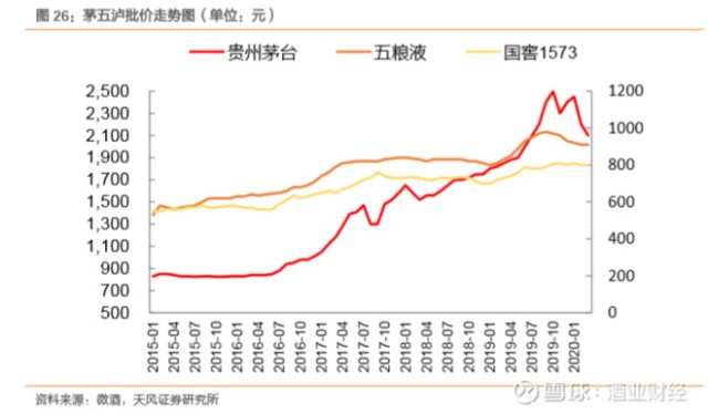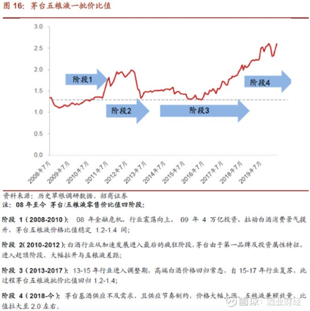 2012 年三公禁令之后,行业整体受损。正是在行业低谷时期,茅台专注维护自身品牌,采取稳价策略;而这段时期,其他高端白酒均跃跃欲试,导致出厂价、终端价倒挂,先提价后降价,价格波动剧烈。造成的结果便是,经销商和市场信心低迷,销量大幅下滑,量价双跌。也正是这一段行业深度调整期,也奠定了茅台绝对的白酒龙头地位。