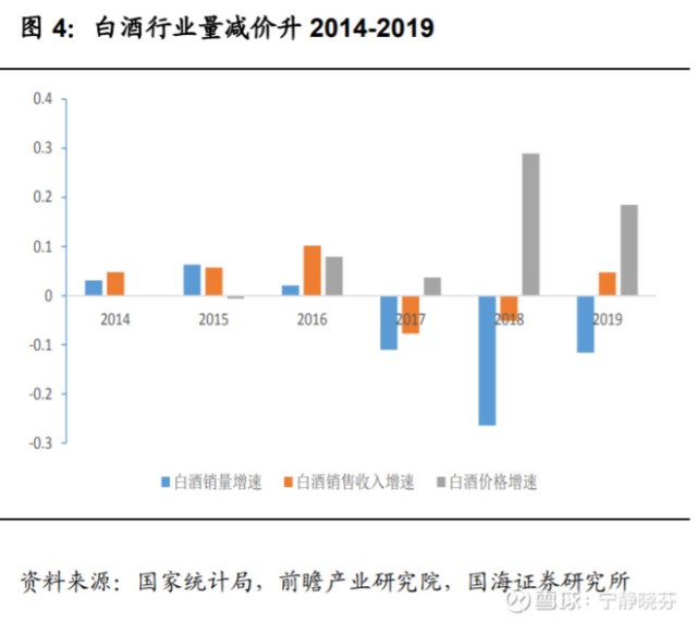 白酒行业量减价升,价格支撑行业增长 随着人们收入水平的提高和对生活品质 的追求,消费者逐渐养成少喝酒,喝好酒的习惯,白酒行业量减价升,价格支撑 行业增长。2019 年白酒行业销售收入 5617.82 亿元,同比增长 4.73%;其中白 酒销量同比降低 11.61%,白酒均价同比上涨 18.48%。在产品结构上,低端白 酒的比例降低,中高端以上的白酒受益消费升级带来的扩容。