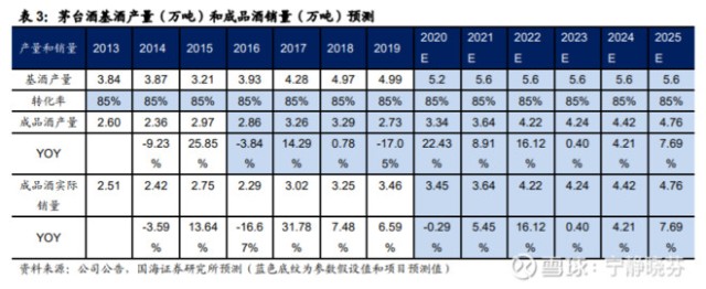 根据公司公告,2020 年度茅台酒销售计划为 3.45 万吨左右,按照该销售计划, 对应销量同比增长(-0.29%),且公司 2020 年度计划安排营业总收入同比增长 10%,那么将主要由吨价提升来实现营收增长。根据 2013-2019 年茅台酒产量 和销量数据,可看出在大多年份成品酒当年销量与产量相差不大,叠加吨价提升 因素,预计未来茅台实际销量将会低于当年产量,使销量增长于更长的时间区间 内释放。另外,茅台酒现库存 20 多万吨,可以保障未来销量的平稳增长。