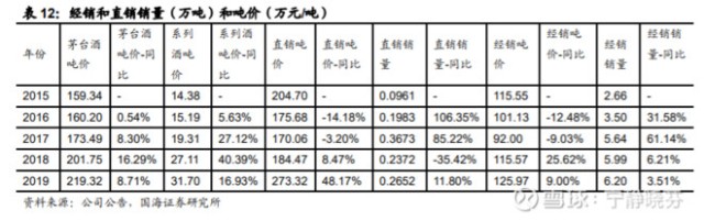 2019 年茅台酒吨价为 219.32 万元/吨,同比增长 8.71%,茅台酒销量为 3.46 万 吨,同比增长 6.48%,吨价增长对营收的贡献比例超过销量增长。2019 年茅台 直销的吨价为 273.32 万元/吨,直销吨价超过了茅台酒吨价,一方面是产品结构 优化带来价格提高,另一方面是直销的出厂价会高于经销。
