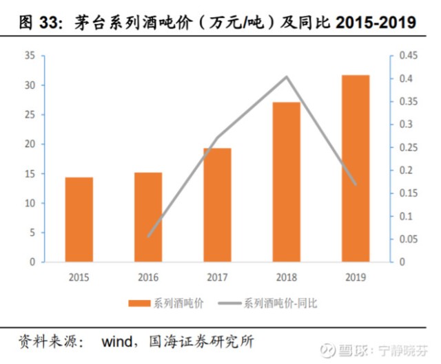 自 2015 年以来,茅台酱香系列酒收入连续增长, 2019 年系列酒实现收入 95.42 亿元。从销量上,2019 年系列酒销量已经增长到 3.01 万吨。在吨价上,茅台系 列酒吨价随着系列酒产品升级的进行也不断上涨,2019 年吨价为 31.70 万/吨, 同比增长 16.96%。