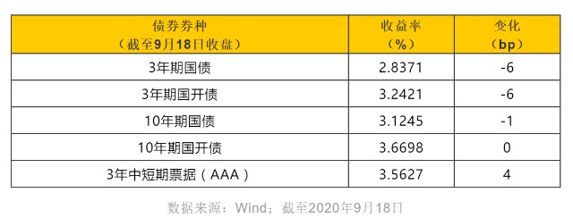 4. 收益率:本周中短端利率普遍下行,长端维持稳定,期限利差走阔,信用利差上行。其中,10年国债下行1BP,10年国开持平;3年国债下行6BP,3年国开下行6BP。3年AAA中短票信用利差84BP,上行3BP(截至2020.09.17)。