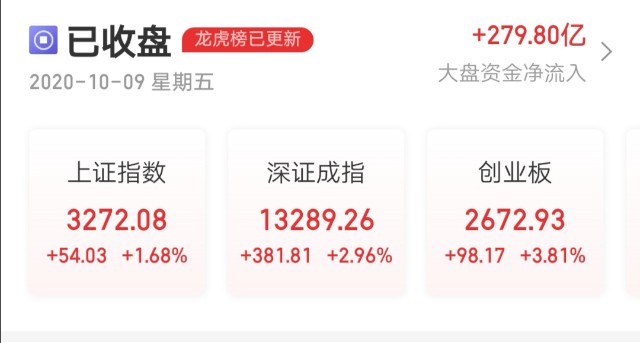 10月9日,A股节后开门红,光伏、动力电池、苹果板块飙升,半导体、汽车板块强势,宁德时代、比亚迪、隆基股份等明星股再创新高。上证指数收报3272.08点,涨1.68%;创业板指报2672.93点,涨3.81%;创业板综指报3070.75点,涨4.01%;深证成指报13289.26点,涨2.96%;科创50报1465.96点,涨3.32%;万得全A报5129.1点,涨2.49%,成交7020亿元。北向资金全天大幅净买入112.67亿元,单日净买入额创7月6日以来新高。