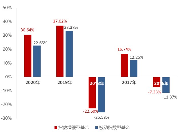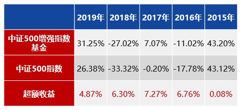 以中证500增强指数基金为例,追溯过去5年业绩可发现:其相对中证500指数的超额收益年年都有。