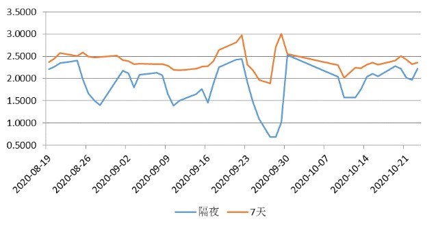 10月23日(周五),R001加权平均利率为2.2182%,较上周涨16.32 BP;R007加权平均利率为2.3587%,较上周涨4.66 BP。