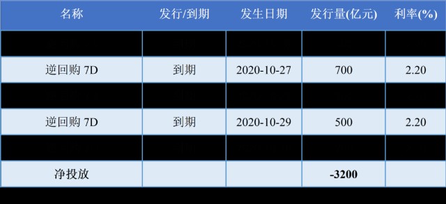 本周(2020/10/19-2020/10/23)央行公开市场有3200亿元逆回购到期,其中周一至周五分别到期500亿元、700亿元、800亿元、500亿元、700亿元,无正回购和央票等到期。此外,此前央行公告称,下周一将进行500亿元1个月期国库现金定存操作。