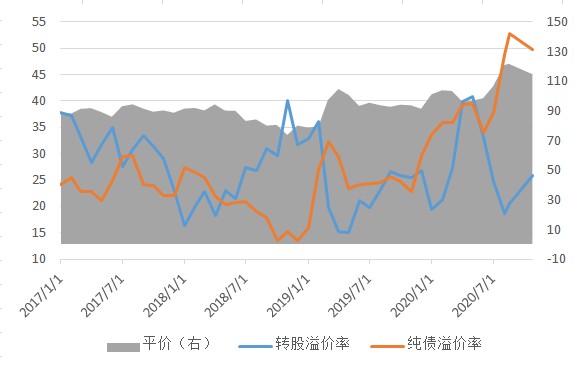 部分转债被过分炒作,个券风险需要防范。本周涨幅超20%的转债平均涨幅随着炒作扩散化而逐步提升,直到周五相关资金开始担忧隔夜政策风险,市场情绪才迅速回落。部分行业波动较大,转股溢价率小幅上升,平价和纯债溢价率小幅下跌。