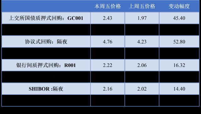10月23日(周五),SHIBOR 隔夜为2.161%,较上周涨14.4 BP;SHIBOR 1周为2.205%,较上周涨0.6 BP。