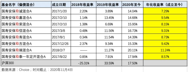 说到国寿安保偏债混合基金,司令印象最深的当属“稳”字辈产品,做了个表格供大家参考。都以A类份额为例,截止2020年11月4日,国寿安保稳诚混合A成立以来年化收益率7.29%,国寿安保稳嘉混合A年化收益率9.54%,国寿安保稳荣混合A年化收益率8.15%,国寿安保稳信混合A年化收益率9.31%,国寿安保稳寿混合A年化收益率8.73%,国寿安保稳吉混合A年化收益率9.42%,国寿安保稳瑞混合A年化收益率11.24%,国寿安保稳泰一年定开混合A年化收益率8.57%,“稳”字辈8只偏债混合基金平均年化收益率9.03%,对于不少指望超越银行理财年化收益率的投资者来说,吸引力确实不小。