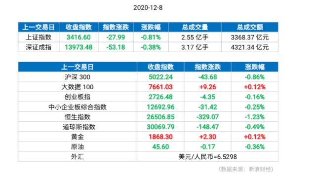 截至收盘,沪指跌0.81%报3416.6点,深成指跌0.38%,创业板指跌0.16%,两市合计成交7690亿元,北向资金净流出11.6亿元。