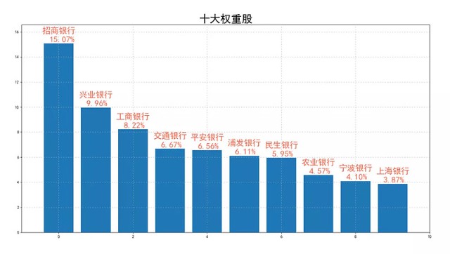 十大权重股中招商银行占到指数份额的15.07%,兴业银行占9.96%,第三大权重股工商银行占到8.22%。