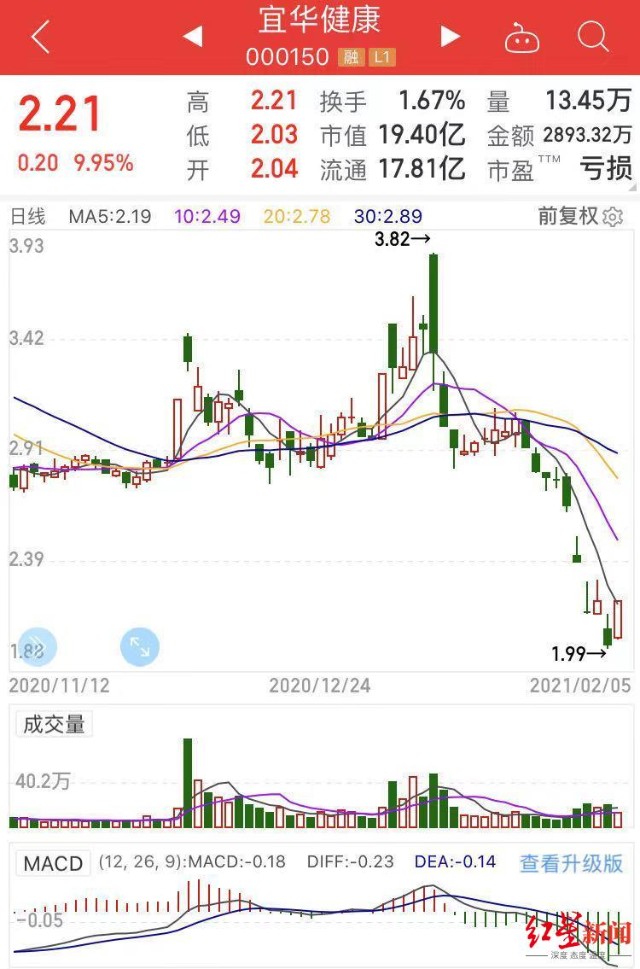业绩颓势之下,宜华健康的股价也进入了下行通道,在2月4日刷出了1.99元/股的新低,不过2月5日又以涨停报收,暂报2.21元。