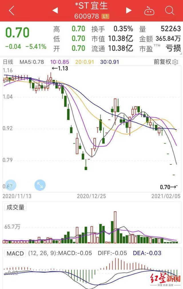 截至2月5日收盘,*ST宜生股价为0.70元,已经连续14个交易日收盘价格低于1元。即使后面6个交易日天天涨停,其股价也无法重返1元大关,这意味着*ST宜生将直接退市。