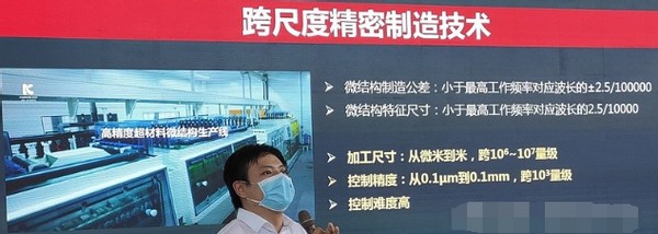 在光启组织的这次参观活动中,参观者除了看到众多的结构件产品样品,有飞机的、无人机的、导弹的、舰艇的,还看到了超材料金属薄膜,上面刻满了用放大镜才能看得到的各种不同的花纹式微结构,这些微结构的密度达到了每平方米625万颗,而且每个微结构里面还有相应的结构。