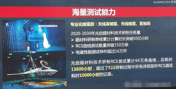 至于沈阳某客户的某款尖端战机,光启从一开始就参与研发测试,如不出意外,该款战机整机机体10%以上的结构件都是由光启提供的。凭着光启在超材料方面的垄断优势,如果在该战机量产阶段没有更新的技术出现,整个量产周期内的超材料结构件也是由光启提供的。