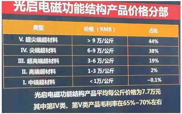 假设2030年超材料产品需求量真的达到1000吨,其中超尖端和尖端的超材料产品全部由光启生产(按现在的情况看10年内光启没有像样的竞争对手)。