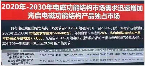 光启2020年9月10日公告:"光启尖端某大型复杂超材料构件产品已达到重要应用节点,预计近期可进入批产交付阶段。该产品是我国同类大型复杂超材料构件中首个进入应用节点的,产品重量是公司目前已批产同类产品最大重量6倍以上,该单一产品明年的交付量预计达到6,000公斤至8,000公斤"。根据2021年2月4日公司公告,该批产产品已经进入投产阶段,两年内的订货需求达到17吨,为光启至今最大的订货需求。