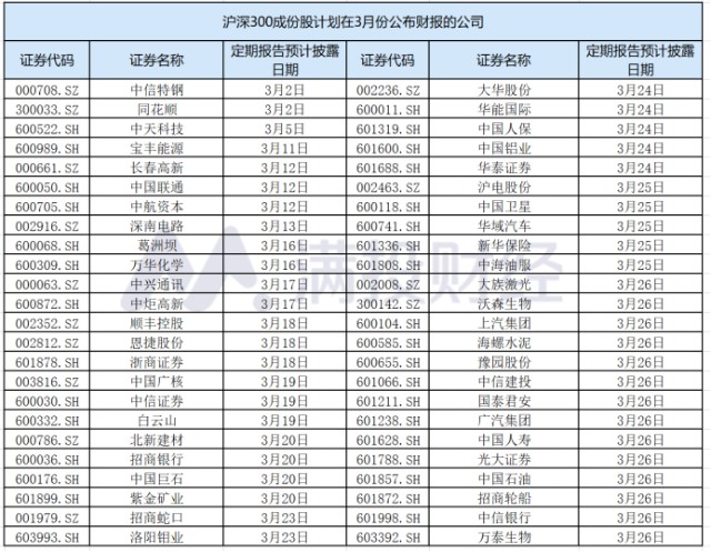 A股财报披露时间是有严格的规定,像年报要求在每年1月1日——4月30日之间公布,若迟发研报轻则通报批评,重则摘牌退市,因此在每年这时间被称为A股的财报季。还有一个重要日期,就是定期报告预计披露时间,也就是公司的审计结束可以公布财报的时间,这是一个重要日期。到了预计披露日期的这一天上市公司就要公布新的财报。下图是沪深300三月份财报的公布预计披露日期,小伙伴们可以收藏好了。
