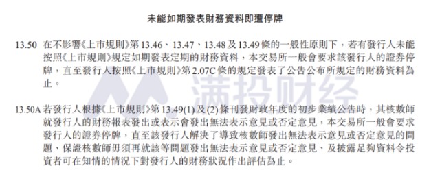 如果未能如期发布上述财务资料,上市公司将面临停牌,后果还是挺严重的。规定要求:在不影响《上市规则》第13.46、13.47、13.48及13.49条的一般性原则下,若有发行人未能按照《上市规则》规定如期发表定期的财务资料,本交易所一般会要求该发行人的证券停牌,直至发行人按照《上市规则》第2.07C条的规定发表了公告公布所规定的财务资料为止。