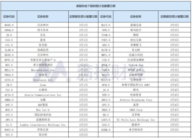 下面是知名美股企业在三月份公布的报表预彼露日期: