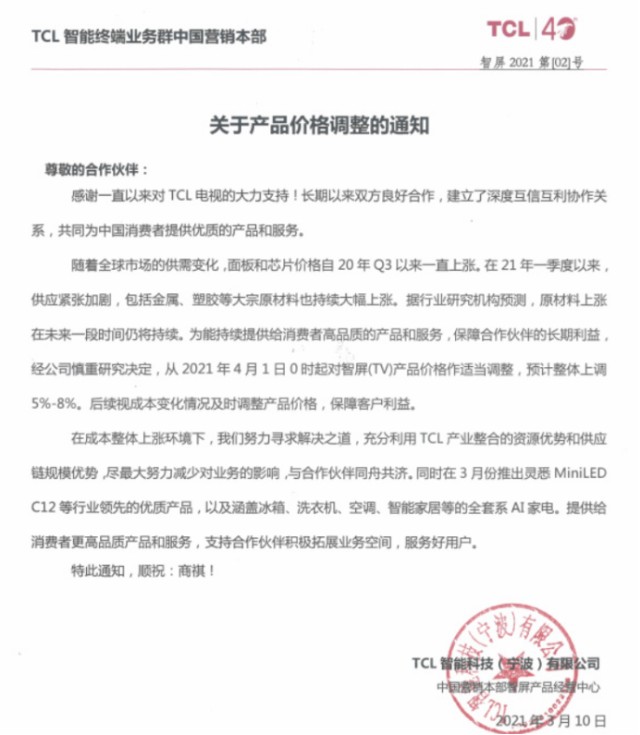 值得注意的是,作为第二大面板生产企业、电视行业头部品牌的TCL凭借着其在上游面板材料上的稳健布局以及技术资源优势,依然坚强地挺过了这段“涨价热潮”,始终保持着稳定价格。但受全球市场的供需变化,如今TCL也采取了调价,据TCL智能科技(宁波)有限公司发文称,自2021年4月1日起,TCL将对智屏产品价格做适当的调整,预计整体会上调5%~8%。