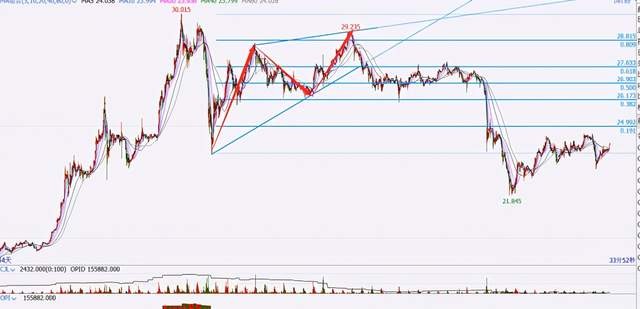 这是某银的小时图,从浪型看B浪调整力度较大,几乎回撤到了A浪高点。