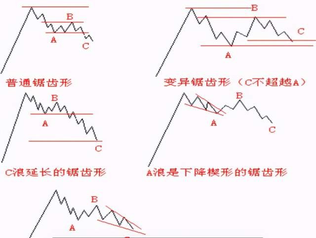 2、B浪可以是任意调整浪,内部结构非常复杂,在小周期上多出现锯齿形,在大周期上多出现平台形。