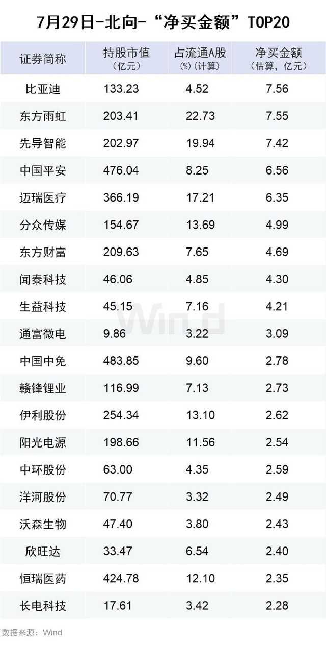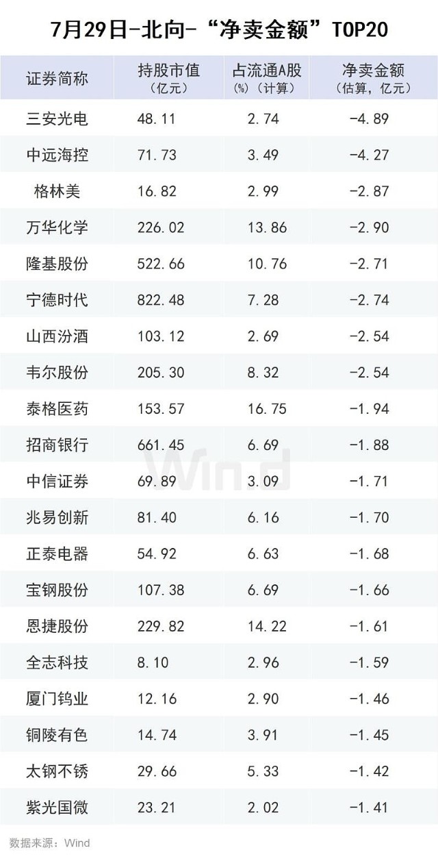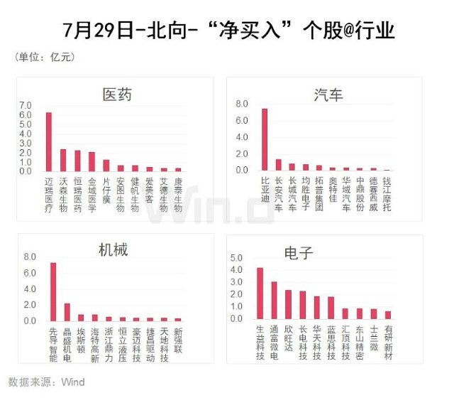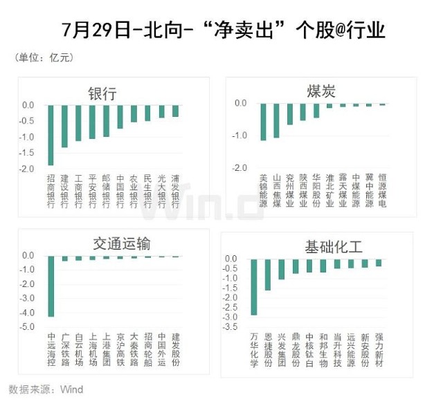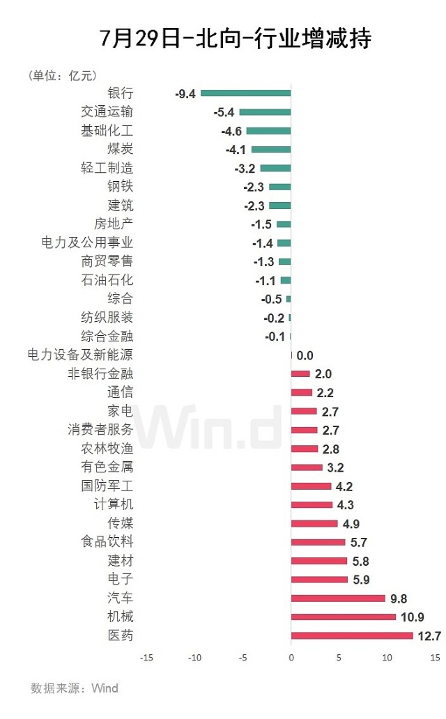 Wind通过统计分析发现,从行业角度来观察,7月29日,北向资金净买入前五的行业有:医药、机械、汽车、电子、建材、食品饮料;净卖出金额靠前的行业有:银行、交通运输、基础化工、煤炭、轻工制造。