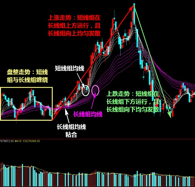 短线组均线反映的是短线交易者的行为,长线组均线反映的是长线投资者的行为。