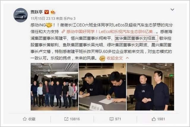 2016年11月5日,乐视出现资金危机,贾跃亭收到了来自长江商学院同学的40亿元投资,他专门发微博表示感谢,其中提到的同学,就有刘绍喜。