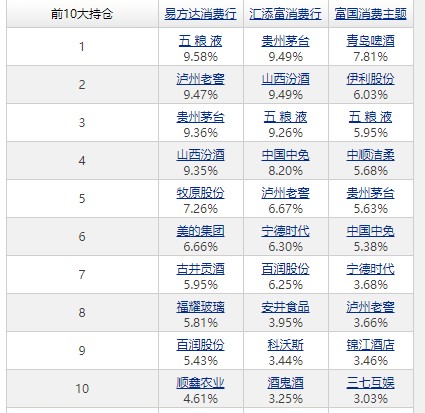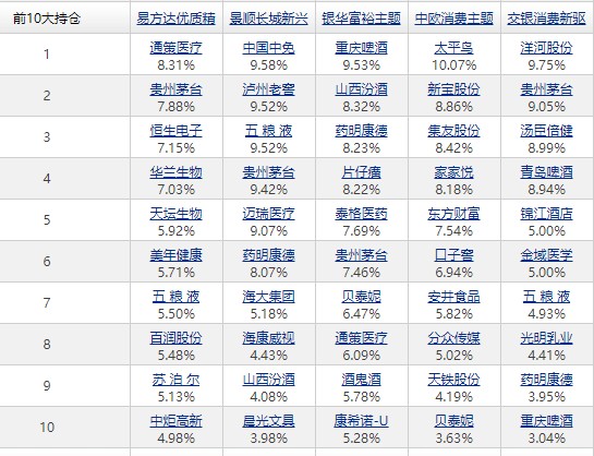 比较热门的有张坤的易方达优质精选混合(之前叫易方达中小盘)、刘彦春的景顺长城新兴成长、焦巍的银华富裕主题混合、郭睿的中欧主题消费、韩威俊的交银消费新驱动股票等。从基金持仓来看,都是以酒类、食品饮料、家电、农业等大消费为主要持仓,然后配置了部分医药、消费电子等泛消费领域,甚至还有配置小仓位的券商等其他非消费行业股票。