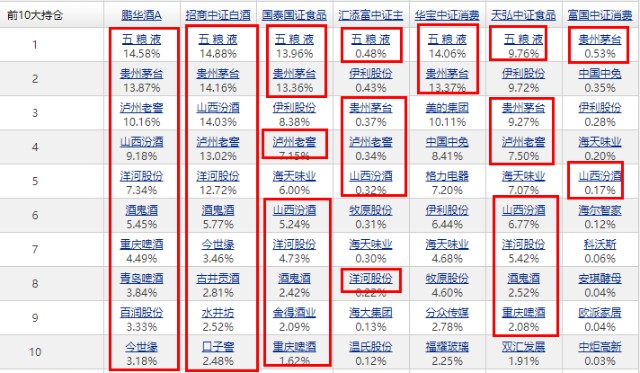 招商中证白酒指数全部是白酒,鹏华酒主要是酒其次是啤酒等其他酒类,食品饮料酒类也是绝对的重仓,消费龙头、消费50和主要消费中白酒也都是重仓,但是占比明显下降。(其中一部分是联接型基金,持仓显示不全,想了解基金具体可自行查阅)