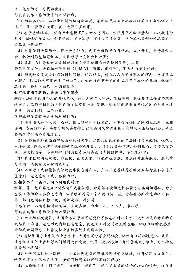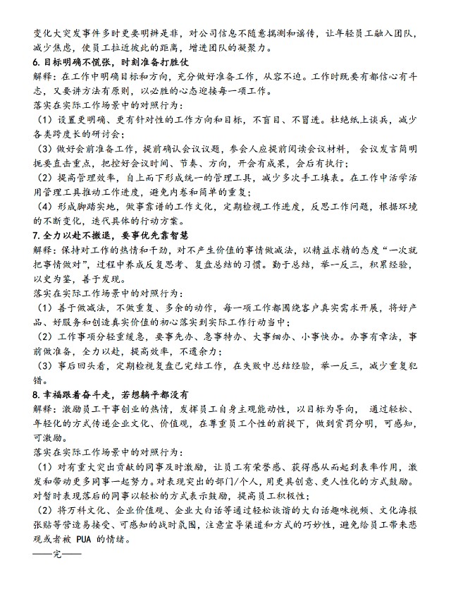 第二,严于律己勇担当,以身作则做表率。第三,你我皆为经营者,彼此都是当家人。第四,广泛交圈不遮掩,资源共享不浪费。第五,船长水手一条心,同心同路向前行。第六,目标明确不慌张,时刻准备打胜仗。第七,全力以赴不撤退,要事优先靠智慧。第八,幸福跟着奋斗走,若想都没有。