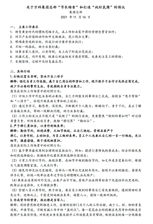 据网传,万科集团总部于日前发布了《关于万科集团总部“节衣缩食”和打造“战时氛围”的倡议》(下称《倡议》)。公开报道显示,该《倡议》得到万科内部人士证实。